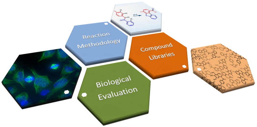 The research of the group is based on chemical synthesis. We focus on the development of novel methods for the synthesis of small compounds and following application of the developed reaction methodology for preparation of focused compound libraries. Obtained compounds are studied using cell based assays and chemical genetic approaches to evaluate possible targets. Furthermore, we are elaborating new synthetic strategies for the preparation of complex lead molecules with pronounced bioactivity.